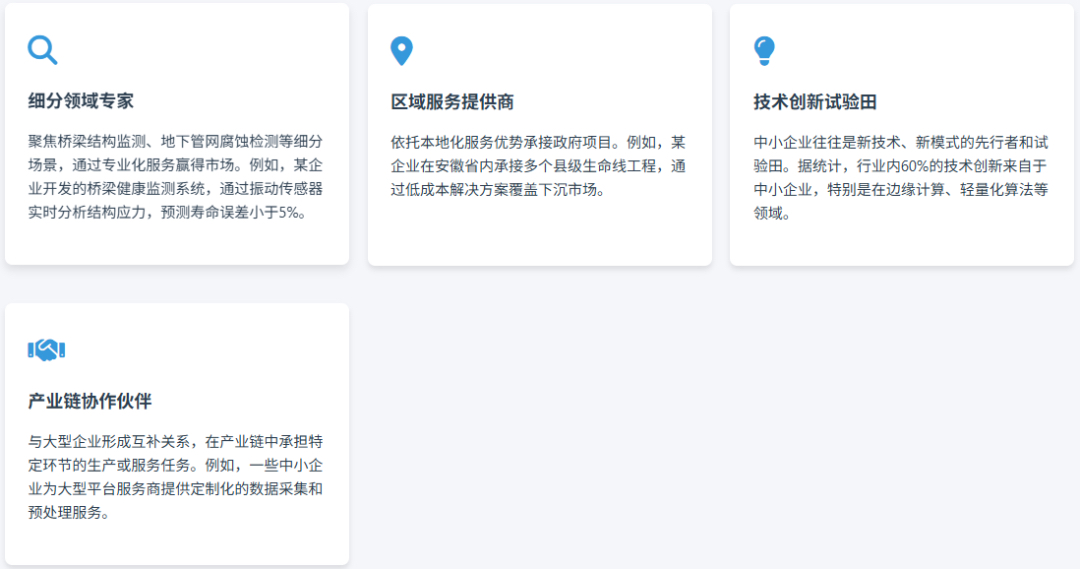 - 聚焦橋梁應(yīng)力監(jiān)測、地下管網(wǎng)腐蝕檢測等細(xì)分場景,如某企業(yè)研發(fā)的橋梁應(yīng)力監(jiān)測系統(tǒng),壽命預(yù)測誤差<5%,形成技術(shù)壁壘;依托本地化服務(wù)優(yōu)勢,拓展縣域及下沉市場(如安徽縣域生命線項目,單項目造價控制在 500 萬元內(nèi),適配地方預(yù)算)。