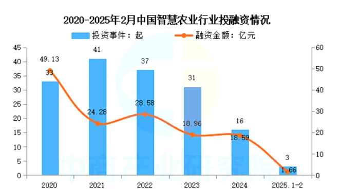近年來,中國智慧農(nóng)業(yè)行業(yè)投資事件數(shù)量及規(guī)模整體呈波動(dòng)上升趨勢(shì)。IT桔子數(shù)據(jù)顯示,2024年我國智慧農(nóng)業(yè)投資數(shù)量16起,已披露融資金額達(dá)18.59億元。2025年1-2月我國智慧農(nóng)業(yè)投資數(shù)量3起,已披露融資金額達(dá)1.66億元。